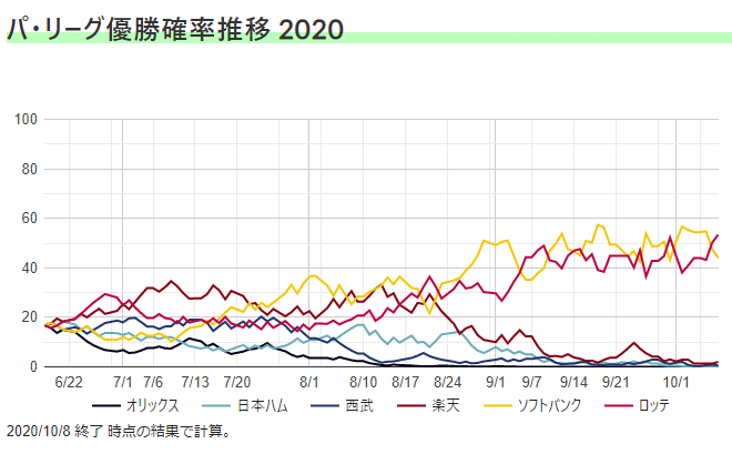 8月終盤から両チームが抜きつ抜かれつを繰り返しながら、他の4チームを引き離していきました。この瞬間はロッテが上に居ますが、推移を見ると、ロッテが頭を出すと、ソフトバンクが粘って抜き返して、ソフトバンクの方が上に居る時間が長くなっています。