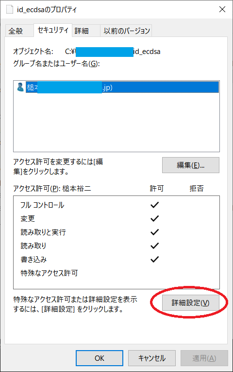 キーファイルを右クリックして「プロパティ」→「セキュリティ」→「詳細設定」
