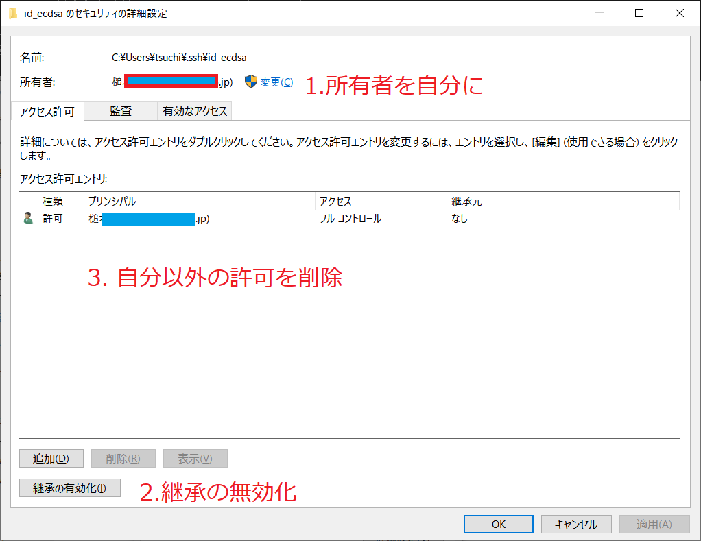 Linux なら “chmod 600 id_ecdsa” で解決なのですが、パーミッションの概念が大きく異なるWindows だとどうしたら良いのでしょうか。