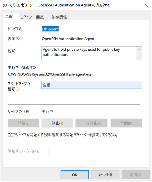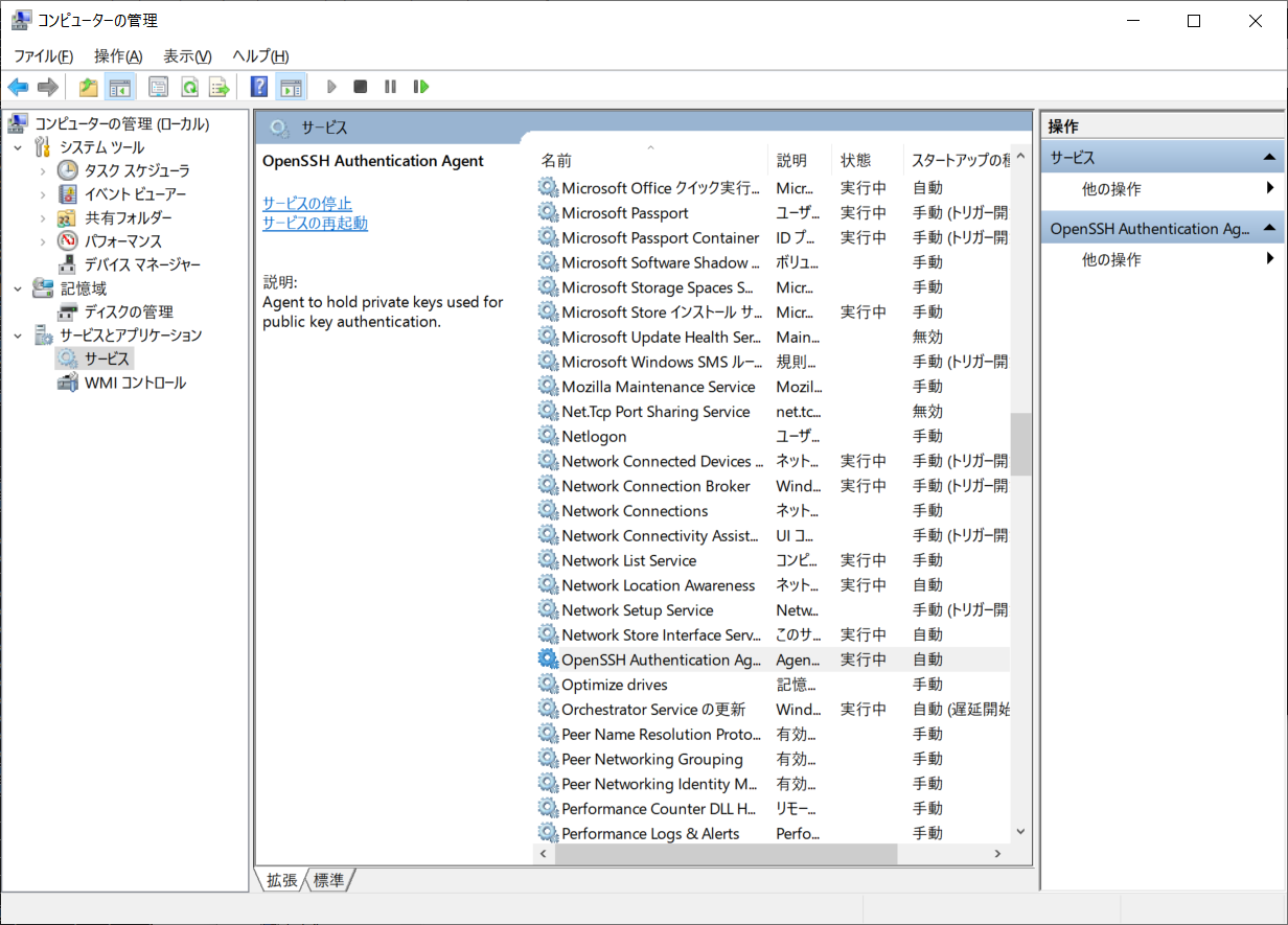 「スタートメニューで右クリック」→「コンピューターの管理」→「サービスをアプリケーション」→「サービス」から「OpenSSH Authentication Agent」を選ぶ