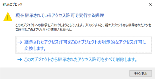 もし、無効化でダイアログが出たら「継承されたアクセス許可をこのオブジェクトの明示的なアクセス許可に変換します」を選択